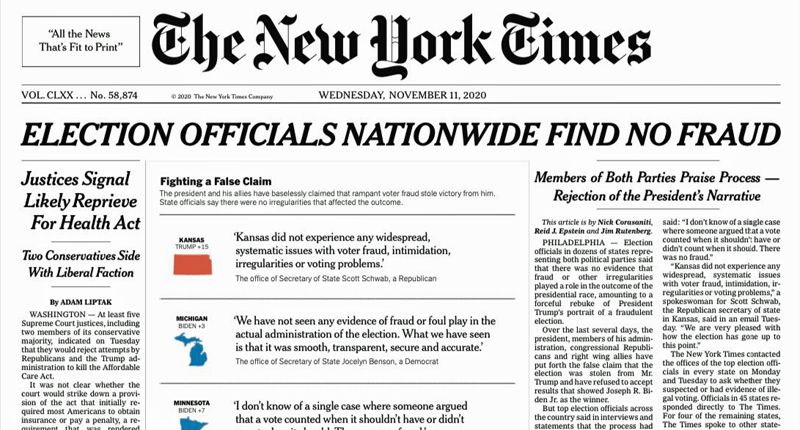 "Election officials in dozens of states representing both political parties said that there was no evidence that fraud or other irregularities played a role in the outcome of the presidential race, amounting to a forceful rebuke of President Trump’s portrait of a fraudulent election," the newspaper reported.