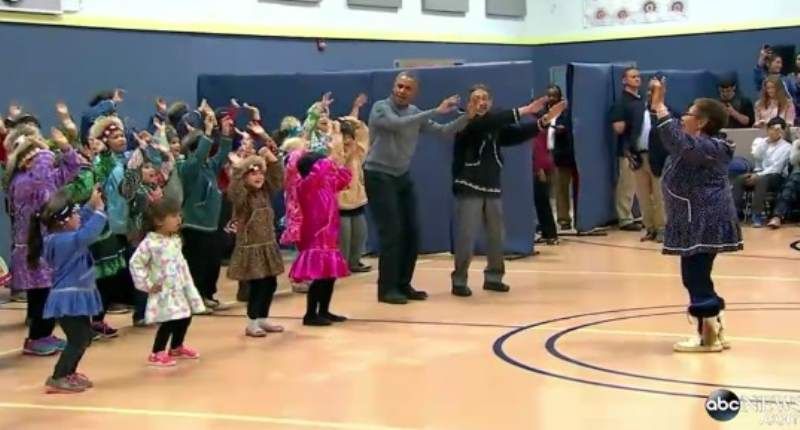 President Barack Obama practices Yup'ik dancing with schoolchildren in Dillingham, Alaska on Sept. 2, 2015. [ABC News]