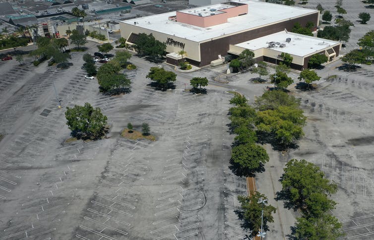 In Plantation, Florida, an aerial view of a deserted Westfield Broward Mall, taken by a drone on May 5.