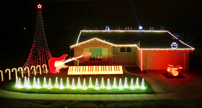 About 100,000 lights are used in the show, which BetGeorge sequences with a special program for Christmas lights called Light-O-Rama . The display features a 17ft guitar, a 19ft keyboard and a standard-sized drum set. Such props, which BetGeorge built himself, light up in time with the music.