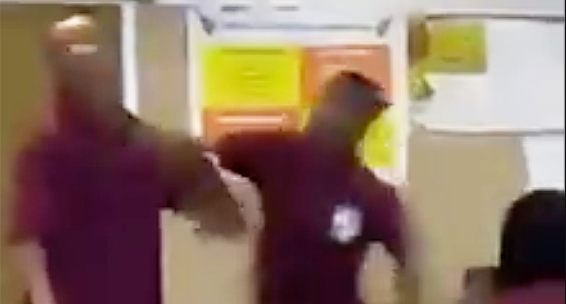 The video seems to be shot from the back of the classroom and ultimately shows the teacher falling to the ground as the student continues to punch him.