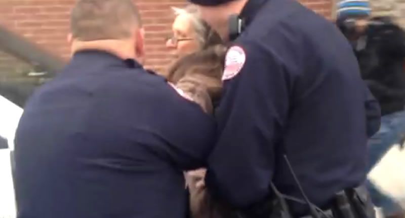 In the video below, three officers can be seen pulling the older woman onto the hood of a squad car and arresting her for resisting arrest.