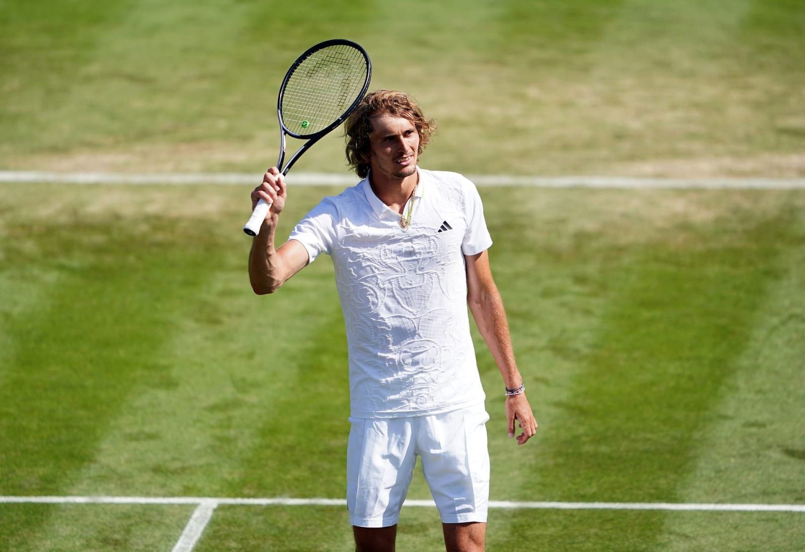 German tennis player Alexander Zverev celebrates defeating Japanese Yosuke Watanuki during their men's singles match on day five of the 2023 Wimbledon Championships at the All England Lawn Tennis and Croquet Club in Wimbledon. Zac Goodwin/PA Wire/dpa