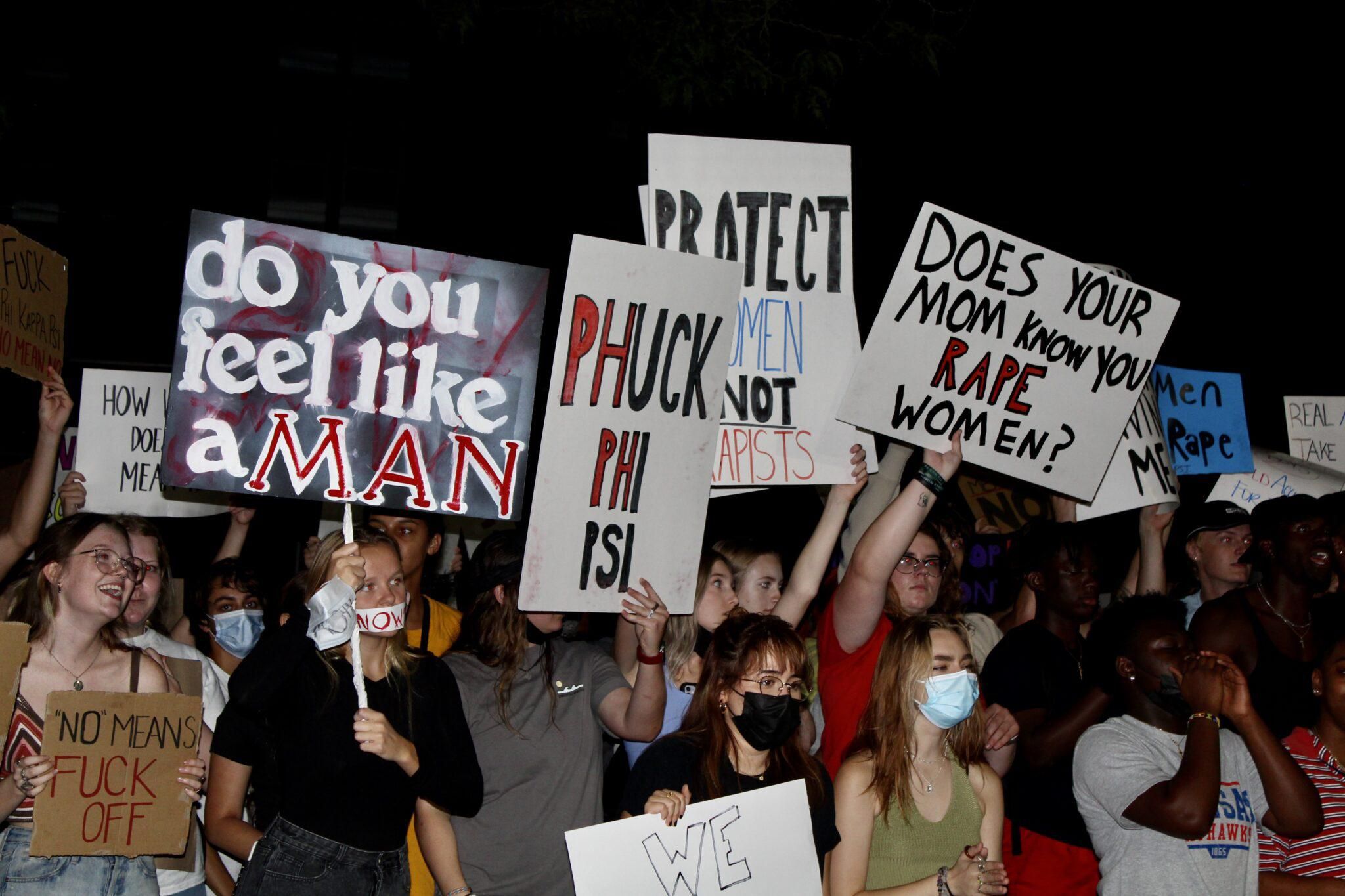 With signs reading “no mercy for rapists" and “hold frats accountable," the students crowded the fraternity's lawn and chanted from its steps, protesting an alleged sexual assault at the Phi Kappa Psi fraternity house on Sept. 11.