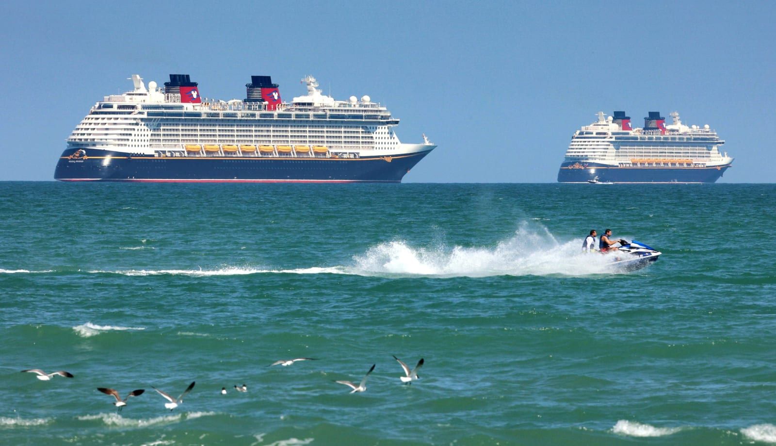 Jet skiers pass the Disney Cruise Line ships Fantasy, left, and Dream on the horizon as they sit stationary off of Cocoa Beach, Fla., in this view from Lori Wilson Park on March 24, 2021. - Joe Burbank/TNS