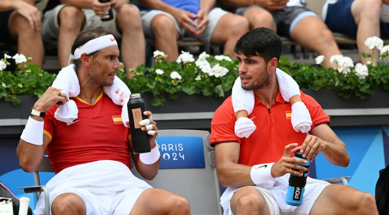 Spain's Rafael Nadal (L) and Carlos Alcaraz (R) attempt to cool off at Roland Garros © MARTIN BERNETTI / AFP