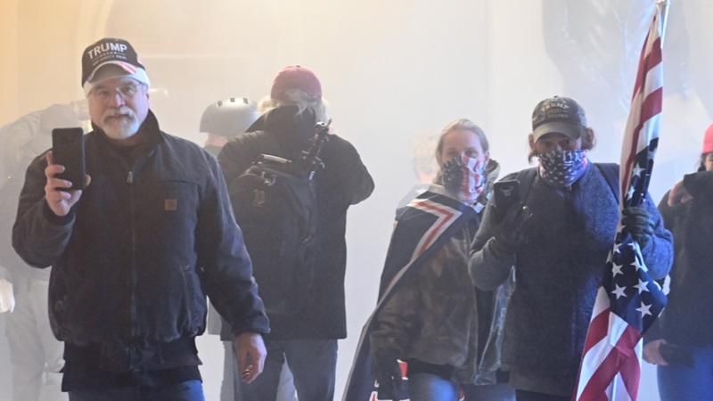 Supporters of US President Donald Trump inside the US Capitol as tear gas fills a corridor on January 6, 2021 (AFP / Saul Loeb)