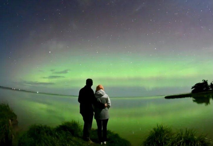 A couple looks out at the southern lights on the outskirts of Christchurch in New Zealand Sanka Vidanagama/AFP)