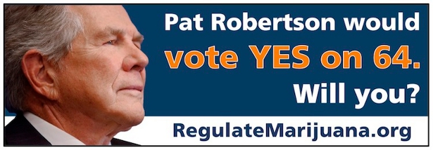 "Many people are familiar with Pat Robertson and appreciate his opinions," Betty Aldworth, the campaign's advocacy director, said in prepared text. "In this case, his opinion is that it makes absolutely no sense to allow adults to use alcohol, yet punish them for using marijuana. Mr. Robertson has also decried the massive amount of money wasted on arresting, prosecuting and imprisoning people for marijuana-related offenses. We hope folks will take this opinion into consideration as they cast their votes on Amendment 64 this November."