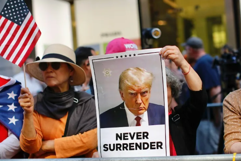 Supporters gather outside Trump Tower on May 31, 2024 before former US President Donald Trump holds a press conference. (Kena Betancur/AFP)
