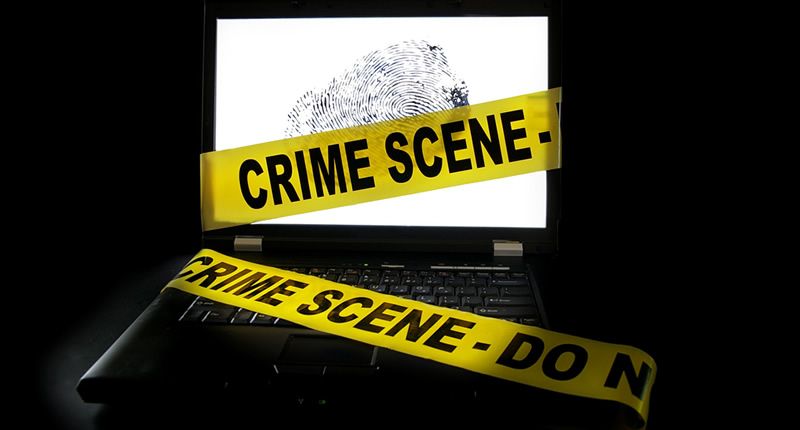 Laptop computer with crime scene tape across it (Shutterstock)