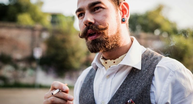 A handsome big moustached hipster man smoking cigarette in the city (Shutterstock)