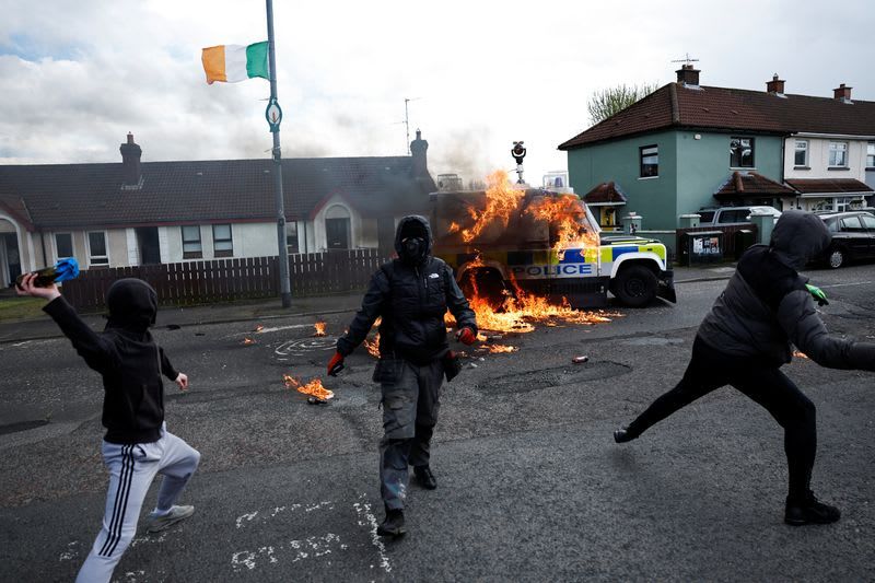 LONDONDERRY, Northern Ireland (Reuters) -A number of masked people attacked a police vehicle with petrol bombs and other objects at a parade opposing the Good Friday peace accord in Londonderry, police said on Monday, a day before U.S. President Joe Biden visits Belfast.