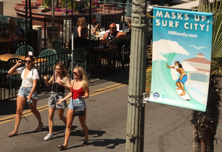 Masks Up, Surf City, banner campaign on Huntington Beach, California.