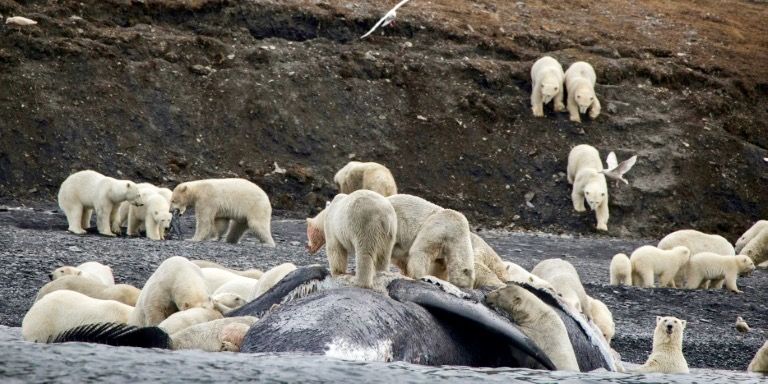 A boatload of tourists in the far eastern Russian Arctic thought they were seeing clumps of ice on the shore, before the jaw-dropping realisation that some 200 polar bears were roaming on the mountain slope.
