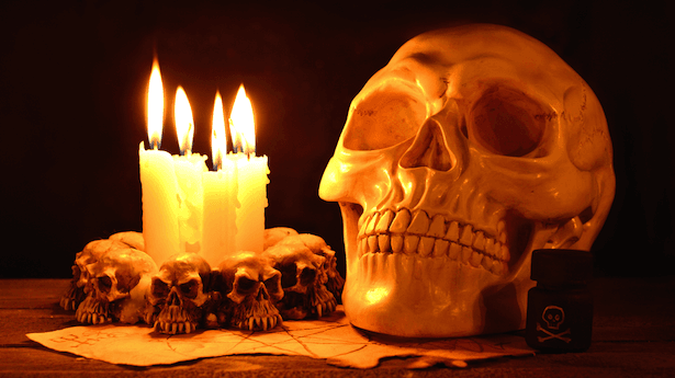 [Image: Creepy human skull with evil candles burning via Shutterstock]