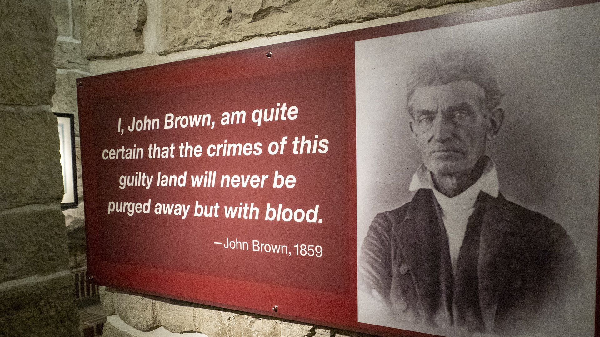 A sign quoting John Brown is seen on March 7, 2023, inside the Kansas Statehouse. The sign is part of an exhibit about Bleeding Kansas. (Sherman Smith/Kansas Reflector)
