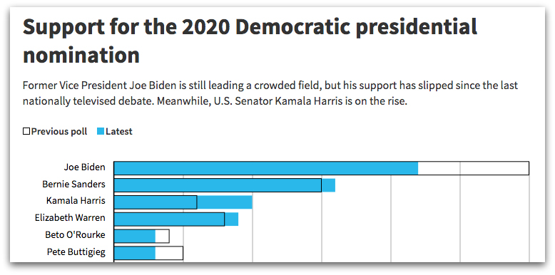 Former Vice President Joe Biden saw his support among black voters cut in half in a new edition of a tracking poll conducted after the first 2020 Democratic presidential debate, during which Sen. Kamala Harris directly confronted him over his past opposition to busing and praise for segregationists.