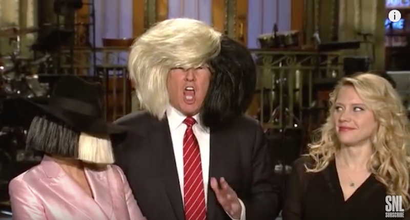 In the 2015 SNL episode Sia and Trump perform a bit where he tries on her wig, a signature part of her public performance.