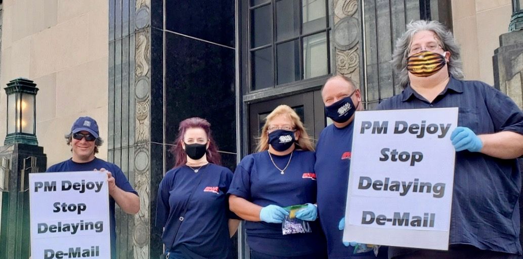 Protesters carried signs that declared "U.S. Mail Is Not For Sale," "PM DeJoy, Stop Delaying De-Mail," and "Senators: Do the Right Thing."