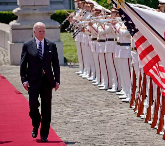 US President Joe Biden reviews an honour guard during a welcome ceremony at the Akasaka Palace in TokyoEugene Hoshiko POOL/AFP