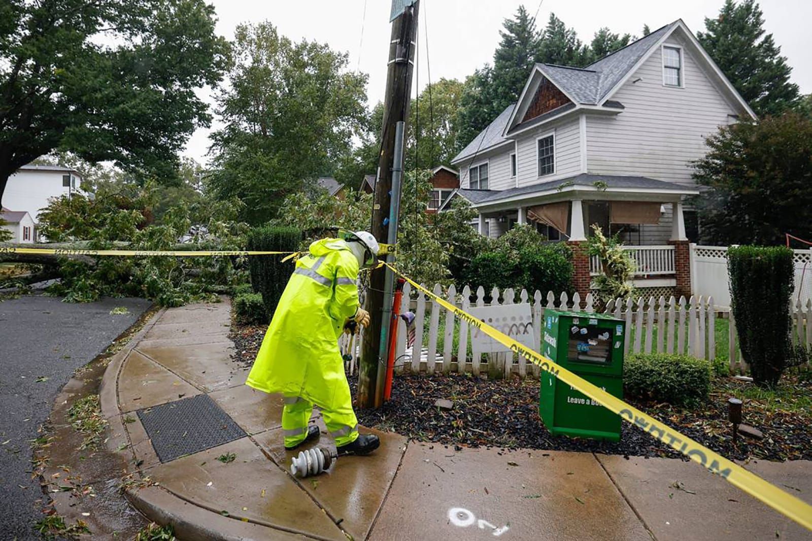 A Duke Energy employee examines an electricity pole near a fallen tree on Holt Street as Hurricane Ian and its remnants begins to arrive in Charlotte, North Carolina, on Sept. 30, 2022. - Alex Slitz/Charlotte Observer/TNS