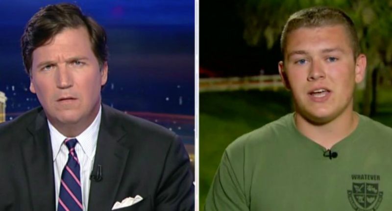 Fox News host Tucker Carlson (left) interviews Parkland survivor Colton Haab (right). Image via screengrab.