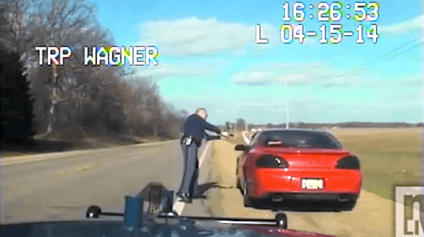 Video posted online by the Kalamazoo Gazette shows the trooper, identified as Timothy Wagner, leaving his patrol car with his weapon drawn after pursuing the driver on U.S. 12 for two miles for speeding.