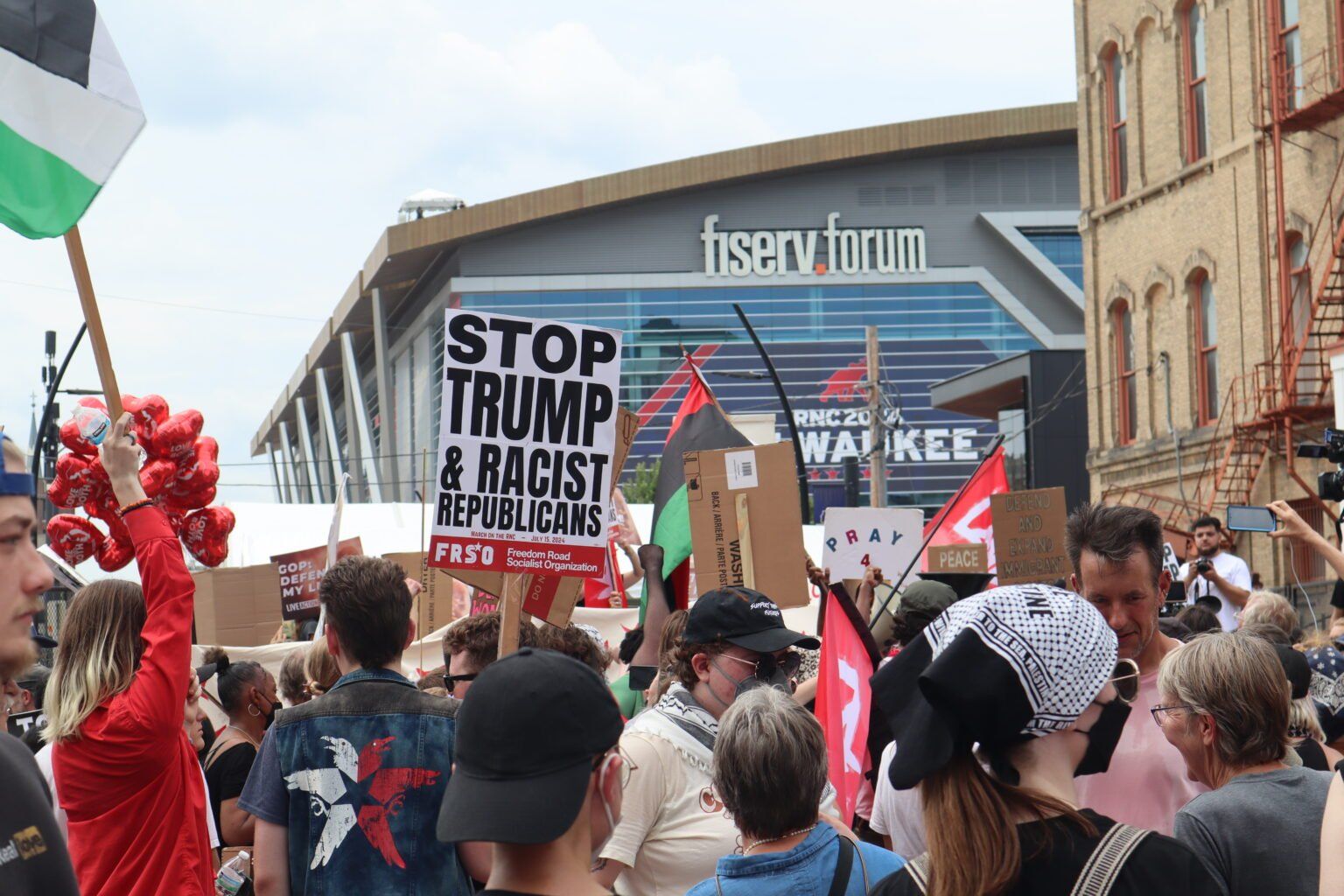 A few blocks from the security fence surrounding the 2024 Republican National Convention in Milwaukee, hundreds of protesters gathered, advocating for the rights of Palestinians, immigrants, women, people of color and LGBTQ people. They came representing groups as varied as “proud Democrats” and “anarchists of Wisconsin” to gather in Red Arrow Park for a rally against Republican policies and Donald Trump, who will become the GOP presidential nominee later this week.