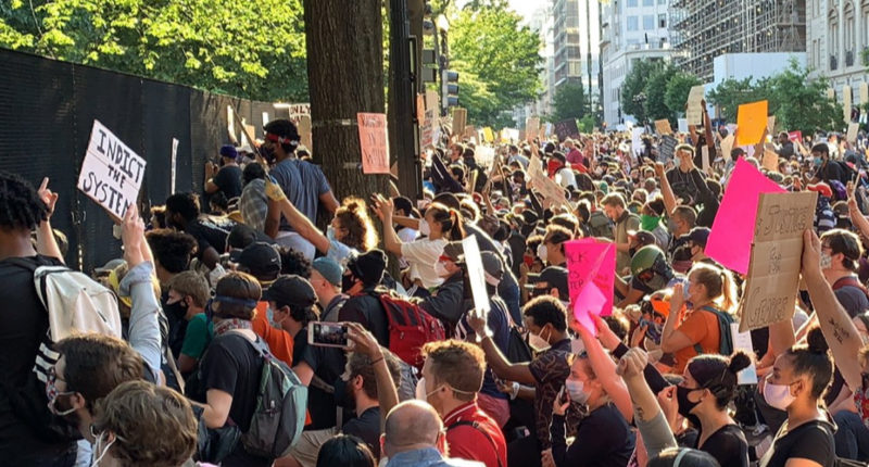 On Tuesday, with just minutes before the D.C. curfew was scheduled to take effect, protesters gathered in Lafayette Park, piling up against the White House fence.