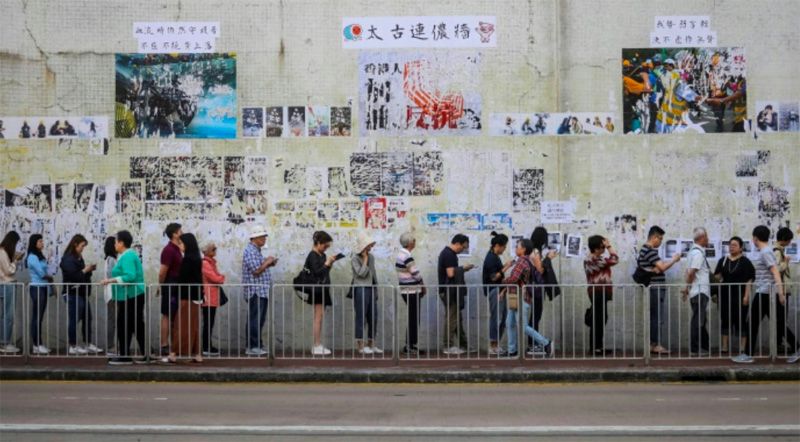 Lengthy queues snaked out of polling stations across the territory in the election for 18 district councils, where high turnout is expected to benefit democratic forces.