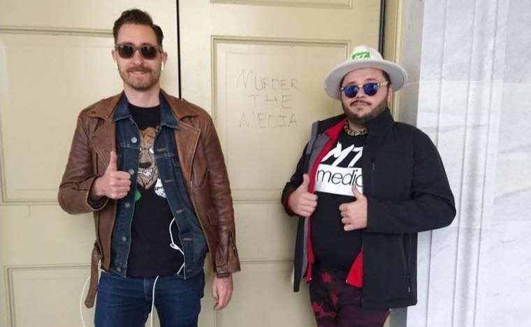 The two men became infamous during the riot for breaking into the Capitol and then writing "Murder the Media" on a doorway. The two men also photographed themselves standing in front of the vandalized doorway giving thumbs-up gestures.