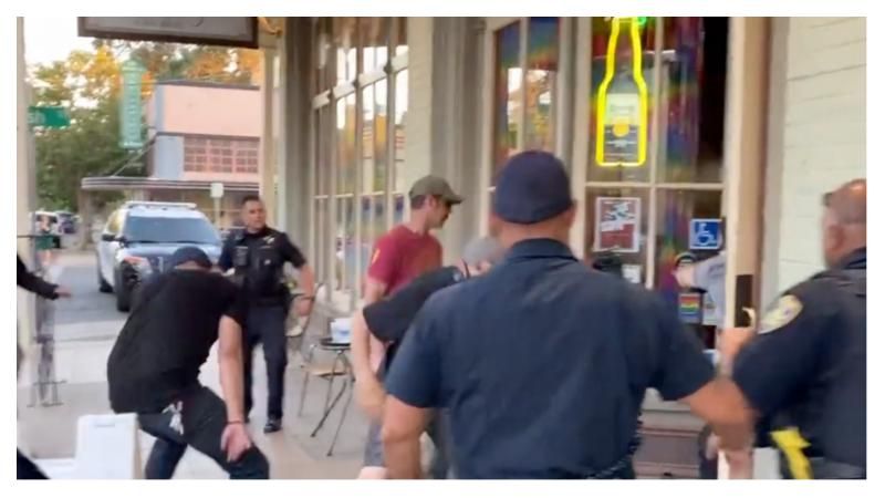 ABC10's Luke Cleary shared video of the confrontation, showing the "alleged Proud Boys" approaching the bar asking, "How many kids are in there?" Then, someone from inside the bar lets off a volley of pepper spray, causing the men and even the police officers on scene to retreat.