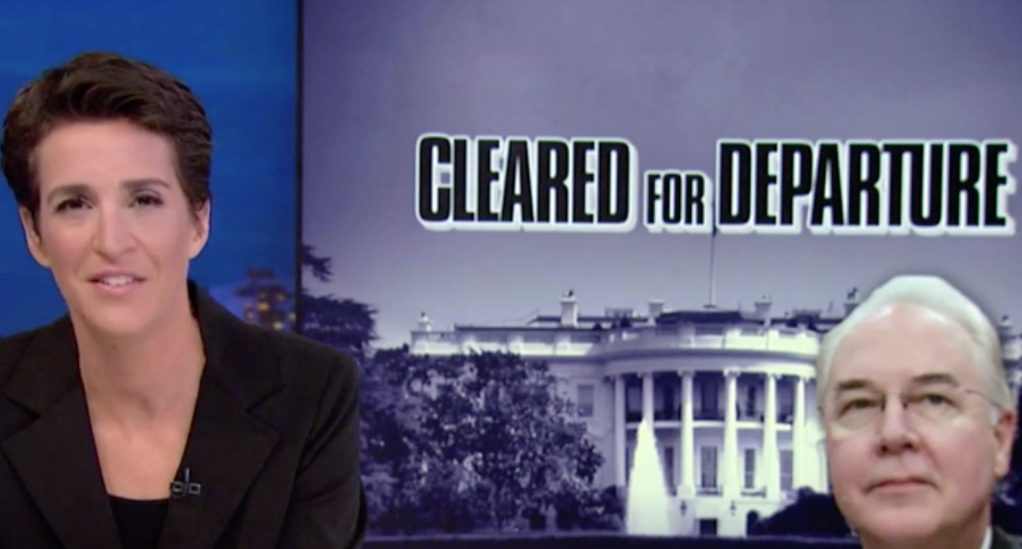 MSNBC host Rachel Maddow discussing the resignation of former HHS Secretary Tom Price (image via screengrab).