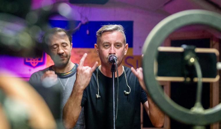 Serhiy Zhadan reads out verse overlaid with melodica music in a purple neon-lit soundproofed chamber.