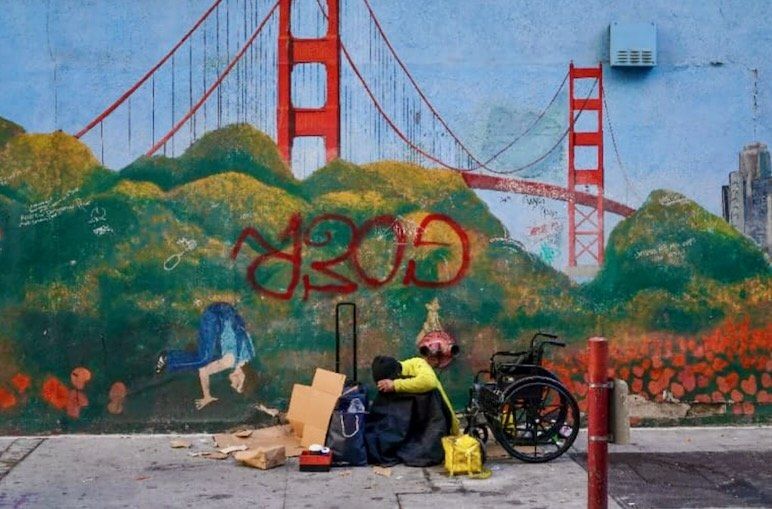 A homeless person leans against a mural of the Golden Gate Bridge near APEC Summit headquarters in San Francisco, California on November 11, 2023