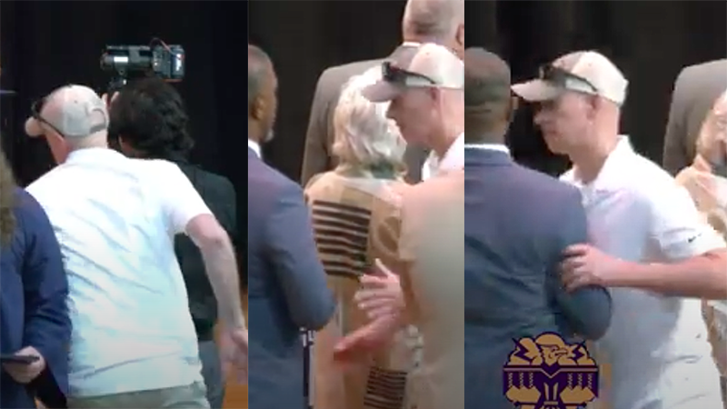 The father, who has been identified as 49-year-old Matt Eddy, jumped on stage, grabbed the superintendent and began dragging him to the back of the stage.