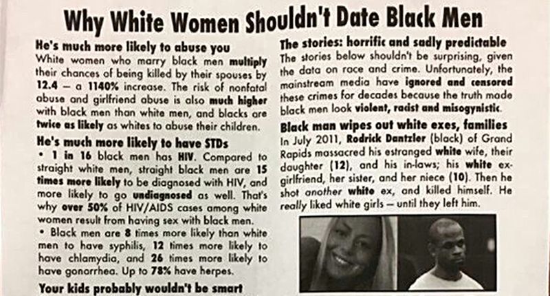 According to the fliers, black men are accused of being more likely to abuse you," and "more likely to have STDs," while warning, "Your kids probably wouldn't be smart."