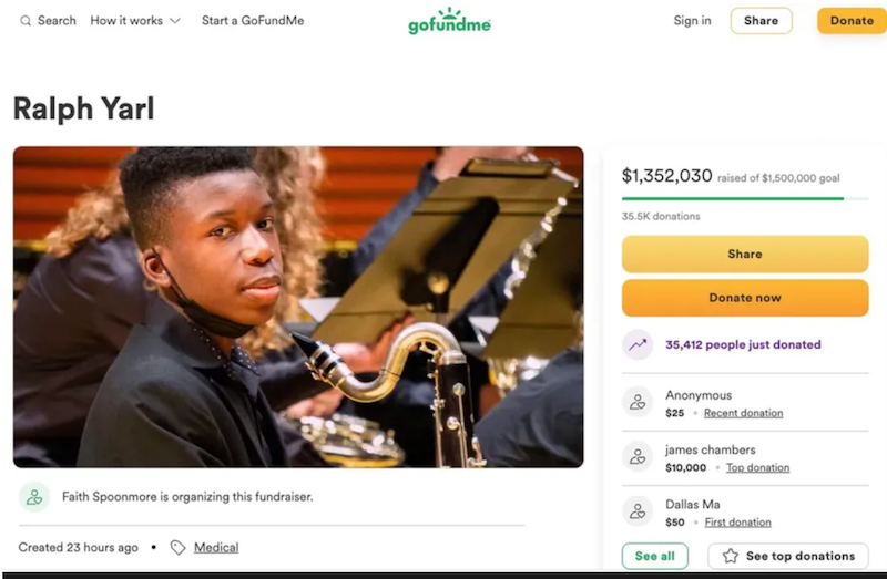Screenshot of a GoFundMe site started to raise money for Ralph Yarl's medical bills and other expenses. - GoFundMe screenshot/TNS/TNS