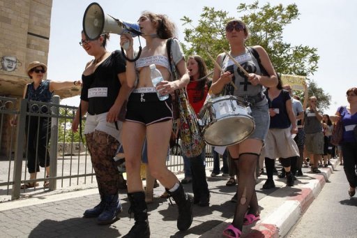 [caption id="attachment_408689" align="aligncenter" width="512"] Dozens of Israeli activists take part in a "SlutWalk" rally in Jerusalem on Friday to protest sexual violence and counter claims that women's attire or behaviour provoke rape and sexual assault, an AFP correspondent said. Predominantly young women and some men marched through central streets of the Holy City in minimal or sexually suggestive clothing, chanting slogans and bearing signs. (AFP Photo/Gali Tibbon)[/caption]
