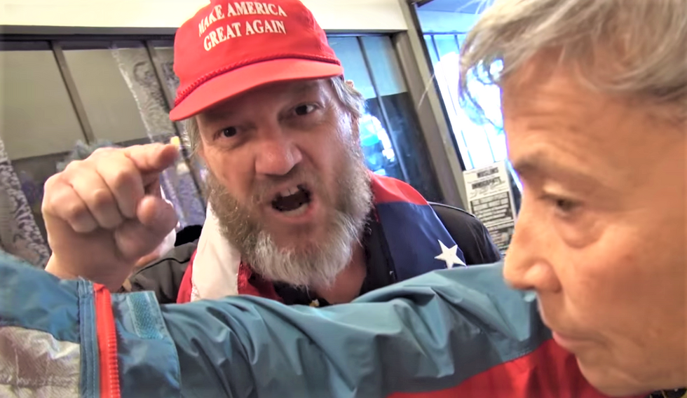 A Trump supporter threatens to burn down Revolution Books in Berkeley, California (Screen cap).