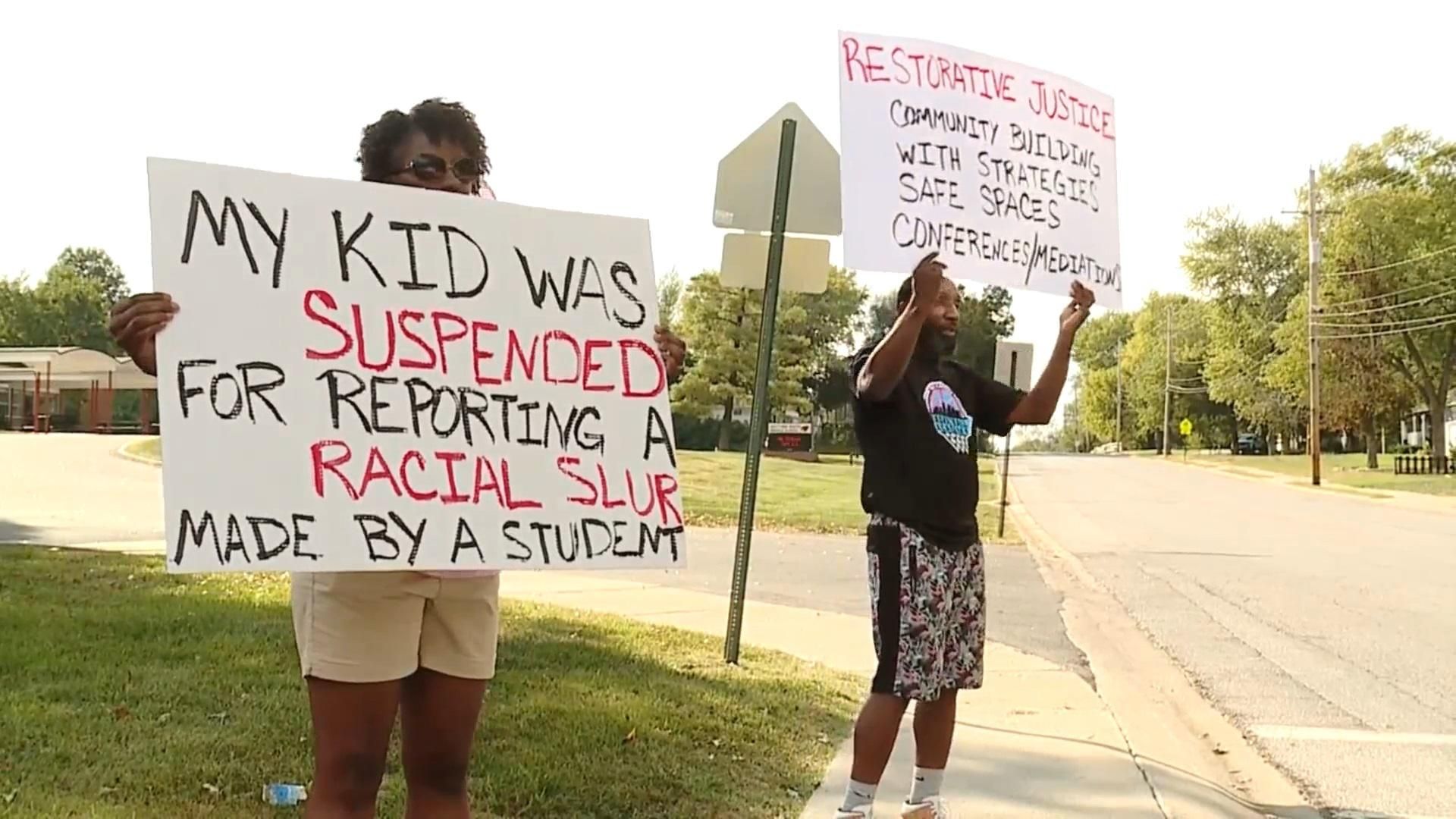 "My kid was suspended for reporting a racial slur made by a student," read a sign held outside the school by the student's mother.