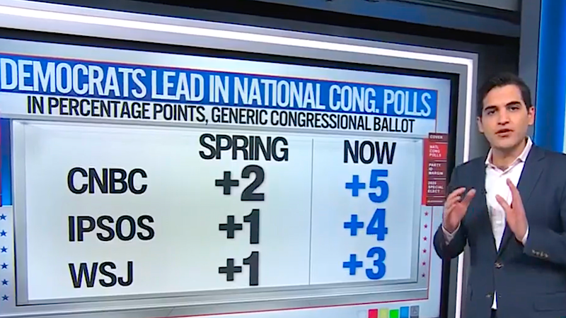 "We're talking about warning signs for the Republican Party," Enten said, "and I will just say uh-oh for them. That is the phrase of the day – uh-oh. Democrats leading the generic congressional ballot, and you can see their lead is expanding. It's becoming bigger. Look at this: In spring, CNBC [polling] it was two [points], now it's five. How about Ipsos? It was one for the Democrats, now it's four. How about the Wall Street Journal? It was one, and now it is three. So now the average lead here is four, which is up from just about a point. That's about a three-point move on average in the Democrats' direction."