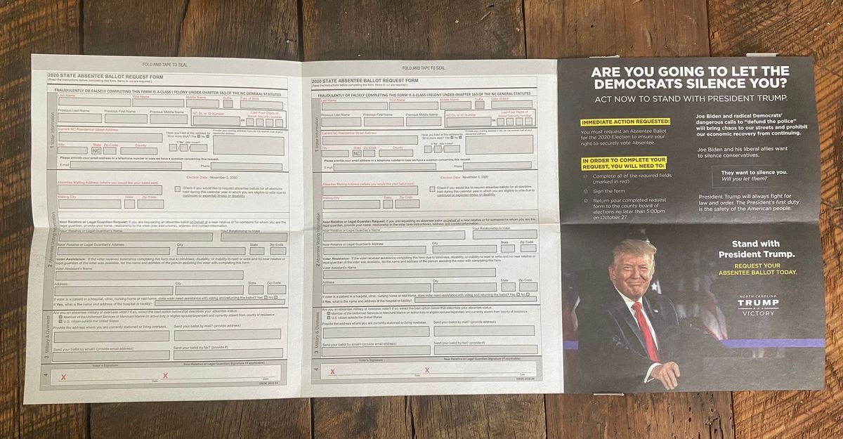 "ARE YOU GOING TO LET THE DEMOCRATS SILENCE YOU?" the mailer, sent by North Carolina Trump Victory, the joint field operation of Trump's re-election team and the Republican National Committee, asks in large block font. "ACT NOW TO STAND WITH PRESIDENT TRUMP."