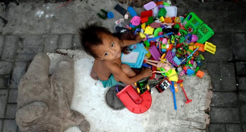 A homeless boy plays with his toys in Manila. (AFP Photo/Noel Celis)