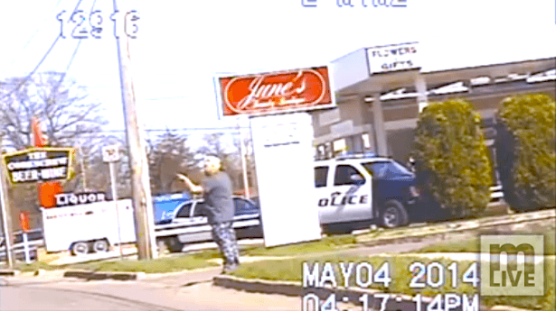 Officers were called May 4 after several witnesses reported the man walking along a street in Kalamazoo with the weapon, and police stopped the man for a jaywalking violation.