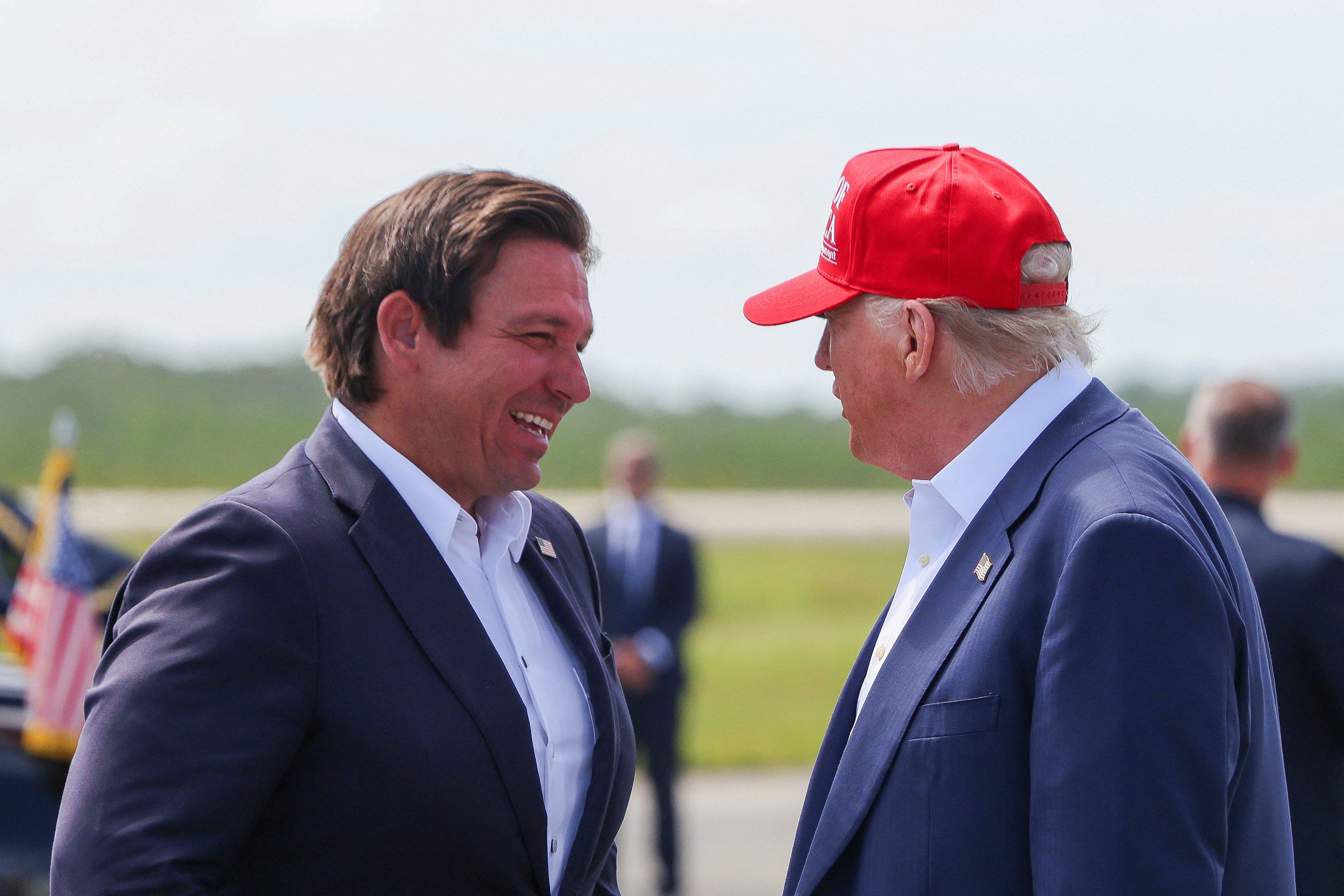 Donald Trump speaks with Florida Governor Ron DeSantis. REUTERS/Evelyn Hockstein