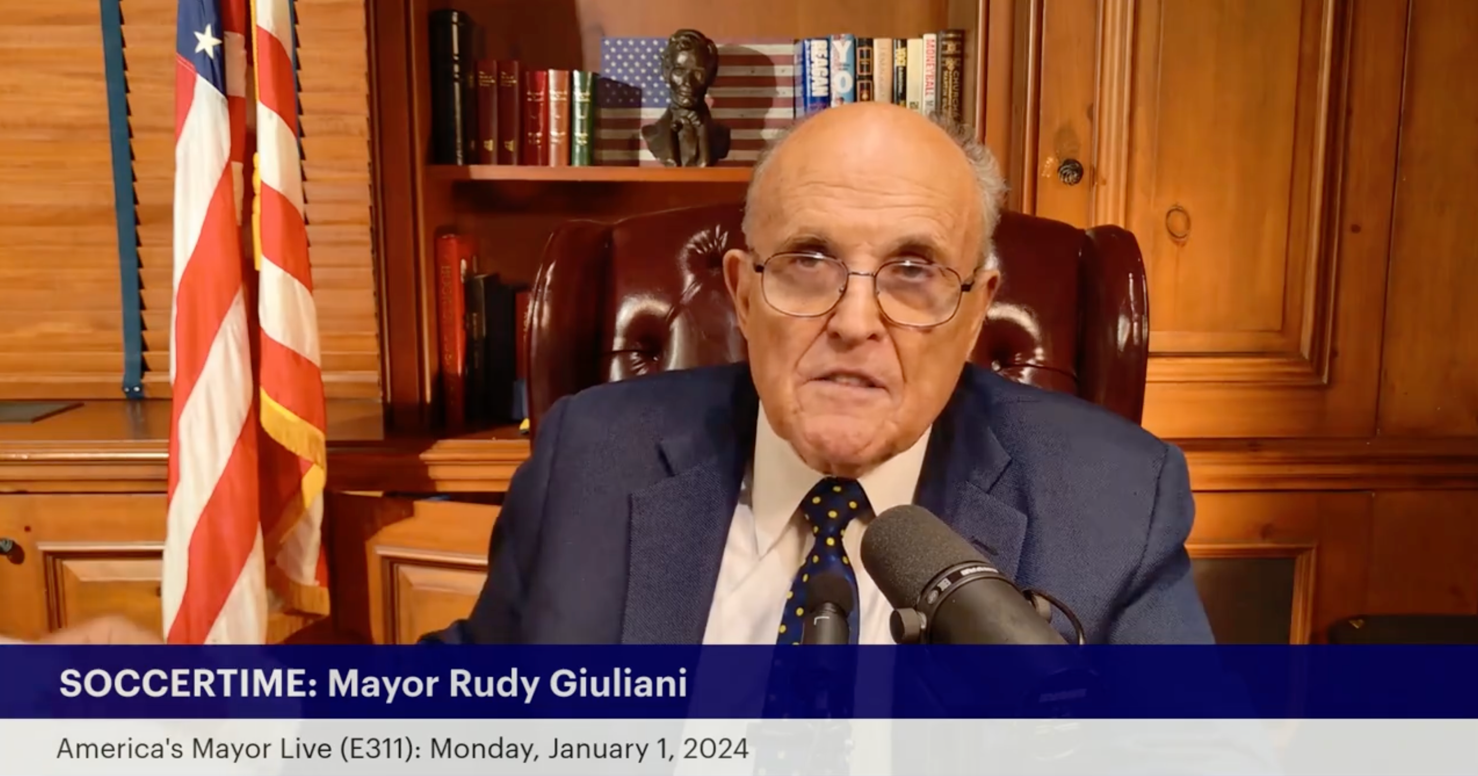 Monday's show features a bespectacled Giuliani sitting behind a microphone discussing previous GOP debate highlights, propping up Trump and alleging President Joe Biden corruption.