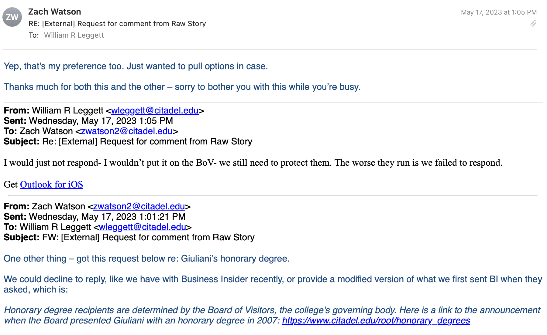 “We could decline to reply, like we have with Business Insider recently, or provide a modified version of what we first sent BI when they asked, which is: Honorary degree recipients are determined by the Board of Visitors, the college’s governing body.Here is a link to the announcement when the Board presented Giuliani with an honorary degree in 2007: https://www.citadel.edu/root/honorary_degrees,” The Citadel spokesman Zachary Watson wrote to Col. William R. “Sonny” Leggett, The Citadel’s vice president for communications and marketing, on May 17.