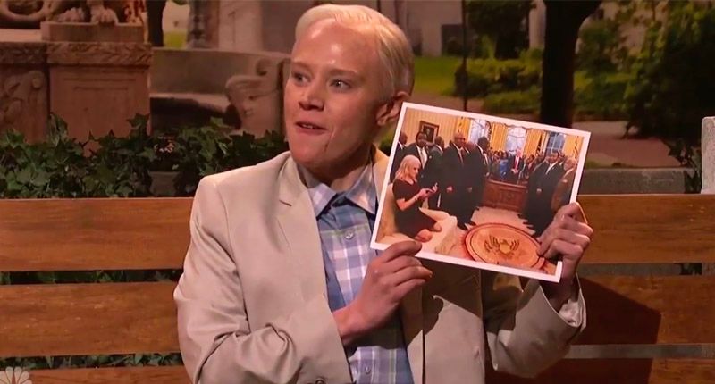 Other passers by came and went, including cast member Beck Bennett as Vladimir Putin, who said, "This meeting never happened."
